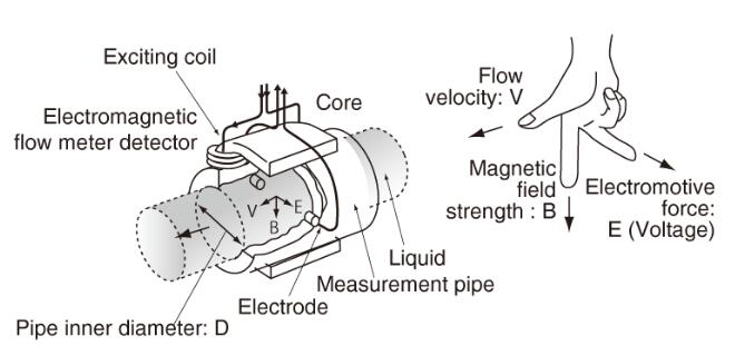 根據(jù)法拉*感應(yīng)定律,在磁場內(nèi)移動(dòng)導(dǎo)電液體會(huì)產(chǎn)生管內(nèi)徑,磁場強(qiáng)度和平均流速都成比例的電動(dòng)勢(電壓)。換句話說,在磁場中移動(dòng)的液體的流速被轉(zhuǎn)換成電力。(E正比于V×B×D)