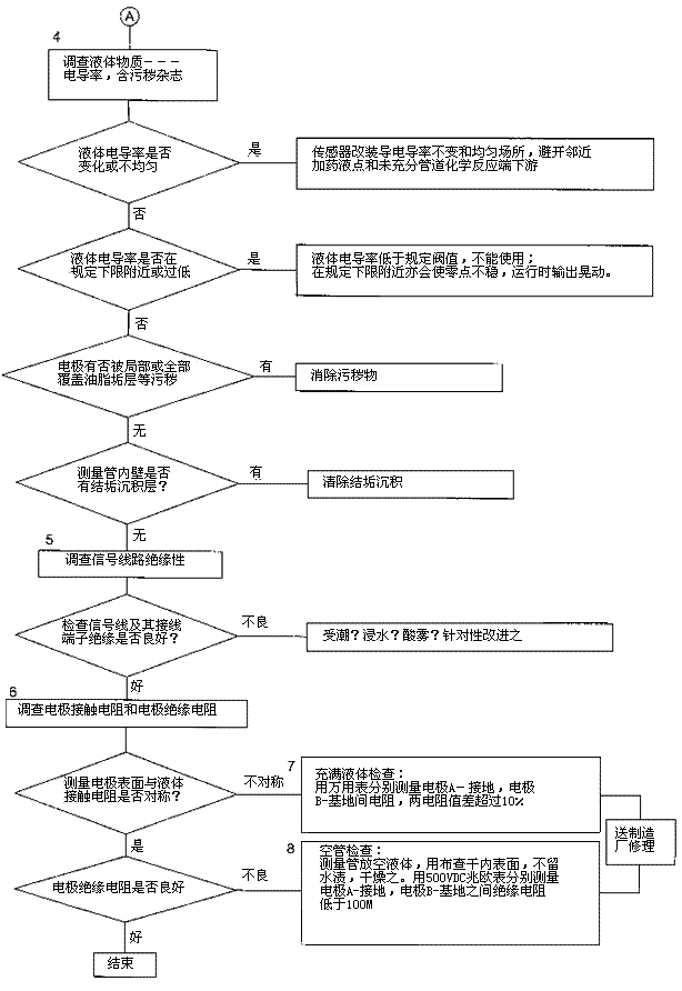 檢查流程圖*5項。信號回路絕緣下降會形成零點不穩(wěn)。信號回路絕緣下降的土要原因足,包極部位絕緣下降所引起的,但也不能排除信號電纜及其接線端子絕緣下降或破壞。因為有時候現場環(huán)境十分嚴酷,稍一疏忽儀表蓋、導線連接處密封不慎,彌漫著潮氣酸霧或粉粒塵埃侵入儀表接線盒或電纜保護層,使絕緣卜降。信號回路絕緣電阻檢查分別按電纜側和流量傳感器側兩郵分進行,用兆歐表測試。因信號電纜容易可先做。流量傳感器再分兩次進行:充滿液體測黽電極表面接觸電阻和個管后測量,U極絕緣電阻。