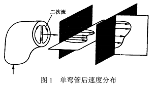 流體流過彎管由于離心力作用,靠外壁產(chǎn)生擴散效應,內壁產(chǎn)生收縮效應,由此產(chǎn)生橫向流動的二次流,引起下游產(chǎn)生速度分布畸變,如圖1所示。圖1中,右邊垂直剖面彎管外緣流速較快,水平剖面呈雙峰值流速分布。隨著液流離開彎管距離增加.畸變會趨于緩和。