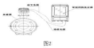 工業(yè)水處理流量計是由流量傳感器和轉(zhuǎn)換器(也叫顯示器)兩大部分組成。測量管上下裝有激磁線圈,通激磁電流后產(chǎn)生磁場穿過測量管,一對電極裝在測量管內(nèi)壁與液體相接觸,引出感應(yīng)電勢,送到轉(zhuǎn)換器。激磁電流則由轉(zhuǎn)換器提供。如圖2所示: