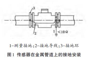 傳感器安裝在塑料管道或內(nèi)壁有絕緣涂層、襯里的管道上,兩端應(yīng)安裝接地環(huán)(或帶有接地電極的金屬短管),然后用導(dǎo)線連接,使管內(nèi)流動(dòng)的介質(zhì)與大地短路,具有零電位(見圖2)。