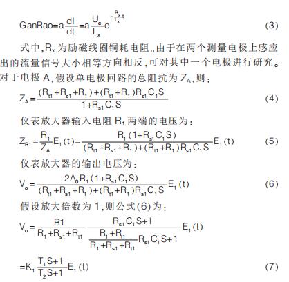 提出在硬件電路上加入模擬開關(guān), 干擾尖峰到來時(shí)斷開模擬開關(guān)避免干擾進(jìn)入后級(jí)電路,尖峰過去重新打開模擬開關(guān);K.Saito 等提出漂移校正法,先以高勵(lì)磁頻率進(jìn)行勵(lì)磁,在勵(lì)磁過程中插入低勵(lì)磁頻率提取用于漂移校正的非固定微分噪聲分量,但在插入的低勵(lì)磁頻率段漿液噪聲較大且很難將漿液噪聲與流量信號(hào)分離,此時(shí)的校正因子非單純的非固定噪聲分量,改進(jìn)措施是長時(shí)間取平均值得到穩(wěn)定因子。 傳統(tǒng)方法是同步采樣保持法,即在磁場(chǎng)穩(wěn)定階段采樣。 其他消除干擾的方法有設(shè)置干擾補(bǔ)償機(jī)構(gòu)、控制勵(lì)磁電流變化率減小干擾幅值、矩形波代替梯形波、希爾伯特黃變換結(jié)合傅里葉變換和程控增益技術(shù)等。經(jīng)上述對(duì)現(xiàn)有的文獻(xiàn)分析與總結(jié)可知, 當(dāng)前消除微分噪聲主要從信號(hào)處理方面入手,并未對(duì)影響噪聲的因素加以研究。 本文建立電極測(cè)量回路等效模型,給出仿真模型搭建、參數(shù)取值和仿真結(jié)果分析。