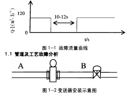 被測液從A流向B(如圖1-2),傳感器水平安裝,電極水平,傳感器下游2m處裝有調節(jié)閥,從圖中可以排除由于傳感器中急劇潴留氣和傳感器后無背壓等情況導致的測量脈動情況產(chǎn)生。