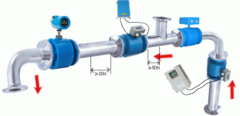 傳感器上游要有一定的直管段,但其長度與其它流量?jī)x表(如超聲波流量計(jì))相比較要求較低。上游如有90°彎頭、T形管、同心異徑管、全開閘閥等擾流件,一般要求離電極中心線(不是傳感器進(jìn)口斷面)有5倍直徑(5D)長度的直管段,如是上游有閘閥且沒有全部打開,一般要求10D長度的直管段;下游直管段長度一般為2D-3D,或更短;