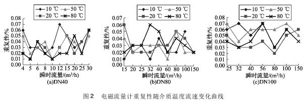 將實驗測得的農(nóng)藥流量計在不同溫度及流速下的重復(fù)性數(shù)據(jù)整理,特性曲線如圖2所示,3組曲線分別對應(yīng)DN40、DN80、DN100的3塊農(nóng)藥流量計的重復(fù)性曲線。