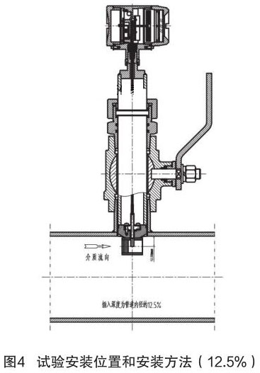 根據(jù)中華人民共和國(guó)機(jī)械行業(yè)標(biāo)準(zhǔn):JB/T9249-2015《煙氣流量計(jì)》進(jìn)行插入式煙氣流量計(jì)的研制與設(shè)計(jì)。在試驗(yàn)過(guò)程中,因?yàn)槔碚撗芯坎怀浞?,再加上?jīng)驗(yàn)不足,采用插入深度是按照以往其它產(chǎn)品(插入式電磁流量計(jì))的經(jīng)驗(yàn),以插入深度為現(xiàn)場(chǎng)管道內(nèi)徑的 12.5% 進(jìn)行試驗(yàn),其對(duì)介質(zhì)流量的檢測(cè)值與同種規(guī)格管道法蘭式結(jié)構(gòu)的煙氣流量計(jì)進(jìn)行比較,偏差值較大、儀表準(zhǔn)確度無(wú)法滿足設(shè)計(jì)要求。試驗(yàn)安裝位置和安裝方法如圖 4 所示。