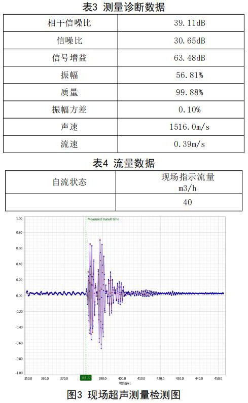 在機組自流補給水狀態(tài):同樣采用德國FLUEX 高精度外夾式超聲波流量計作為標(biāo)準(zhǔn)流量計,測量 基礎(chǔ)數(shù)據(jù):管道外徑276.93mm,管壁厚度12.40mm, 采用兩聲程169mm傳感器安裝距離,通過對超聲波流量計信號分析與診斷(數(shù)據(jù)見表3和表4),超聲 波流量計測量狀態(tài)符合條件,開始測量,打開凝汽 器入口閥門,流量測量情況如下