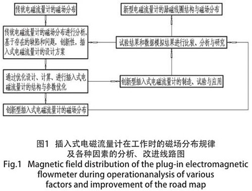 dn80泥漿流量計因其特殊的結(jié)構(gòu)形式,致使其抗干擾能力較弱、準(zhǔn)確度偏低以及瞬時流量波動過大等不良現(xiàn)象,但便于安裝、造價低廉、普遍應(yīng)用于大管道等特點而存在。為了發(fā)揮其優(yōu)勢,消除其不利因素,對其內(nèi)部結(jié)構(gòu)及其相關(guān)技術(shù)參數(shù)進行優(yōu)化設(shè)計,從而使其準(zhǔn)確度能夠達到 ±1% FS,使抗干擾能力得到極大地增強。本文主要通過優(yōu)化設(shè)計、選擇材料和試驗,使dn80泥漿流量計的穩(wěn)定性和準(zhǔn)確度大幅度提高,并提出解決措施,對實際應(yīng)用具有參考價值。分析與研究程序圖如圖 1 所示。