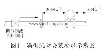 根據(jù)圖1渦街流量安裝要求示意圖及廠家的設(shè)備說明書要求,流量計(jì)上游的直管段長度至少為20D≈1 600mm,下游的直管段至少在5D≈400mm,D=80mm 為管道直徑。圖2為現(xiàn)場(chǎng)安裝圖,流量計(jì)上游僅為600mm <1 600mm,此流量計(jì)安裝位置有誤,對(duì)測(cè)量值有一定的影響,造成測(cè)量偏差,需調(diào)整流量計(jì)的安裝位置。