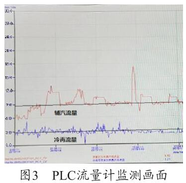 通過圖3 PLC 流量計(jì)監(jiān)測(cè)畫面可以看出,PLC 上輔汽測(cè)量用的沼氣流量計(jì)的量程設(shè)置為30t/h,現(xiàn)場(chǎng)設(shè)備量程實(shí)際為6t/h,兩者嚴(yán)重不符,因此測(cè)量值4t/h 為錯(cuò)誤值(單臺(tái)機(jī)組運(yùn)行),需要對(duì)程序進(jìn)行修改。