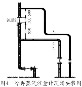 根據(jù)圖1渦街流量安裝要求示意圖及廠家的設(shè)備說明書要求,流量計(jì)上游的直管段長度至少為20D≈1 300mm,下游的直管段至少在5D≈325mm,D=65mm 為管道直徑。圖4為冷再蒸汽流量計(jì)現(xiàn)場(chǎng)安裝圖,流量計(jì)上游僅為950mm<1600mm,此流量計(jì)安裝位置有誤,對(duì)測(cè)量值有一定的影響,造成測(cè)量偏差,需調(diào)整流量計(jì)的安裝位置。