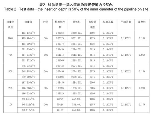 插入式壓縮空氣流量計插入深度為現(xiàn)場管道內(nèi)徑的50%時,試驗數(shù)據(jù)如下(以 DN200 為例):