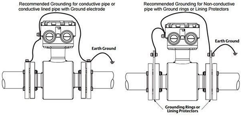 法蘭式流量管:當(dāng)法蘭式流量管安裝在非金屬,塑料,PVC或襯里的工藝管道之間時,SG必須通過除工藝管道法蘭螺栓之外的其他路徑。在這種安裝方案中,需要接地環(huán)或接地電極(圖6)。