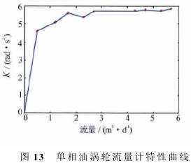 可以看出,渦輪啟動后*先進入一個非線性段,在非線性相應(yīng)段,K值隨著流量增加而增大;當流量比較大(單相水超過0.5m3/d,單相油超過1m3/d)時,渦輪進入線性段,在線性響應(yīng)段,K值達到峰值,有相對較小的波動。