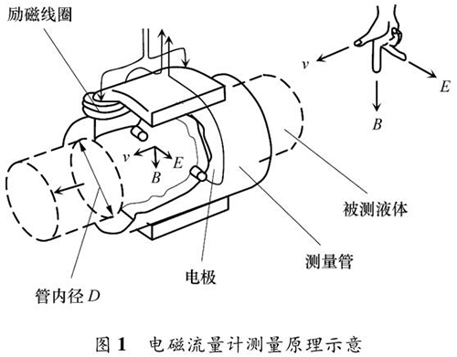液體流量計(jì)的測(cè)量原理如圖 1 所示。根據(jù)法拉*電磁感應(yīng)定律,導(dǎo)電液體在磁場(chǎng)中流動(dòng)會(huì)產(chǎn)生電動(dòng)勢(shì) E,它與磁感應(yīng)強(qiáng)度 B、導(dǎo)電液體平均流速 v 成一定比例關(guān)系: