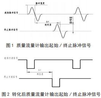將高壓電磁流量計(jì)流量與相關(guān)測試設(shè)備連接起來,就可以進(jìn)行高壓電磁流量計(jì)的校準(zhǔn),時(shí)間差△ t 由專用試驗(yàn)測試設(shè)備可以測出。起始脈沖信號(hào)和終止脈沖信號(hào)如圖 1 所示。經(jīng)過專用試驗(yàn)測試設(shè)備信號(hào)轉(zhuǎn)化后的信號(hào)方波如圖 2 所示。