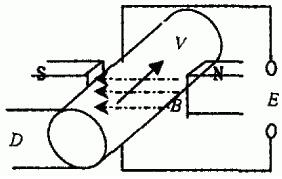 根據(jù)法拉*電磁感應(yīng)定律,即導(dǎo)電液體在磁場中切割磁力線運(yùn)動(dòng)時(shí),導(dǎo)體中產(chǎn)生感應(yīng)電勢(見圖1),其感應(yīng)電勢的大小與磁感應(yīng)強(qiáng)度、流體做切割磁力線強(qiáng)度等因素成正比。