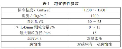對跑漿進(jìn)行分析后發(fā)現(xiàn),跑漿是一種由煤漿和一些雜質(zhì)混合而成的半流體物質(zhì),當(dāng)管道蒸汽流量計(jì)使用煤倉中煤堆中上部煤時(shí),由于煤質(zhì)較好,跑漿中小煤塊極少,性質(zhì)同正常煤漿,只是固含量稍高;而使用煤堆底部的煤時(shí),煤質(zhì)差管道蒸汽流量計(jì)研磨不充分,跑漿中含有約 15% 的小煤塊,分析后的跑漿物質(zhì)參數(shù)如表 1 所示。
