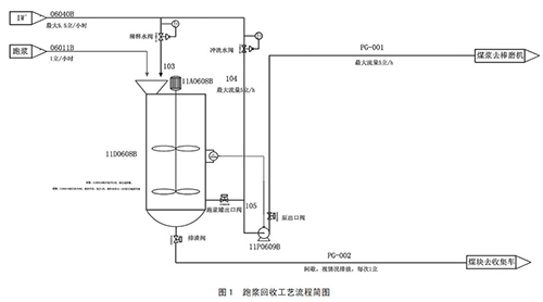 通過以上煤漿提濃通用方法優(yōu)缺點(diǎn)比較可以了解到,在現(xiàn)有設(shè)計(jì)條件基礎(chǔ)上,煤漿濃度提升會(huì)帶來一定設(shè)備損耗及能源損耗。針對這種情況,為了達(dá)到節(jié)能而保證管道蒸汽流量計(jì)不跑漿,對于磨機(jī)跑漿問題進(jìn)行改善,對跑漿進(jìn)行回收,重新送回磨煤機(jī)進(jìn)行二次研磨,降低了管道蒸汽流量計(jì)入口原料煤的粒度;同時(shí)降低了人員勞動(dòng)強(qiáng)度,改善了現(xiàn)場衛(wèi)生情況。具體跑漿回收裝置設(shè)計(jì)流程如圖 1 所示。