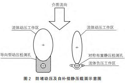新衛(wèi)生渦輪流量計采用拋物面導向型結構作為動壓測點,采用對稱自補償型式的靜壓測點,可以有效地解決來流方向偏流時信號的穩(wěn)定采集,來流偏離管道軸線時,可以維持輸出差壓基本不變,如圖2所示。