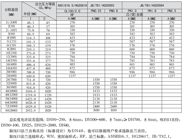 1.總長(zhǎng)度允許誤差范圍:DN50-250,±6mm;DN300-600,±7mm;≥DN700,±8mm。吹掃口直徑:DN50-100,DN25;DN125-3000,DN40。