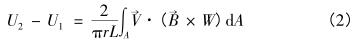 式中,U2-U1是兩電極的電勢(shì)差;A表示對(duì)所有空間積分;L為絕緣管道筒長(zhǎng)一半;r為流量計(jì)截面管半徑;矢量珗B是導(dǎo)電流體的流速;B是磁感應(yīng)強(qiáng)度;W為矢量權(quán)重函數(shù),它是一個(gè)只由井水流量計(jì)本身結(jié)構(gòu)決定的量。由(2)式可知,只要確定了流體的流速V、磁感應(yīng)強(qiáng)度B、以及權(quán)重函數(shù)W,以及流量計(jì)管徑半徑,就可以求流量計(jì)的感應(yīng)電勢(shì)差。
