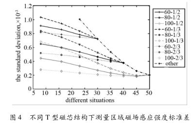 如圖4所示為不同T型磁芯結(jié)構(gòu)下測(cè)量區(qū)域產(chǎn)生磁場(chǎng)感應(yīng)強(qiáng)度標(biāo)準(zhǔn)差,圖中橫坐標(biāo)為T型磁芯b的角度,縱坐標(biāo)為測(cè)量區(qū)域磁場(chǎng)強(qiáng)度的標(biāo)準(zhǔn)差,圖標(biāo)圖例與圖3中一致。從仿真結(jié)果可以看出:T型磁芯的較長(zhǎng)端的角度a越小,流量計(jì)測(cè)量區(qū)域中磁場(chǎng)強(qiáng)度標(biāo)準(zhǔn)差越大;在T型磁芯的較長(zhǎng)端的角度a一定時(shí),T型磁芯的較短端的角度b越小,流量計(jì)測(cè)量區(qū)域中磁場(chǎng)強(qiáng)度標(biāo)準(zhǔn)差越大;在T型磁芯的較長(zhǎng)端的角度a與較短端的角度b一定時(shí),T型磁芯的k1/(k1 + k2)越小,在流量計(jì)測(cè)量區(qū)域中磁場(chǎng)強(qiáng)度標(biāo)準(zhǔn)差越大。