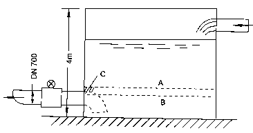 案例4 廣西某水廠在郊區(qū)山頭設(shè)置清水池,利用水池高度勢(shì)能發(fā)送成品水。運(yùn)行人員反映計(jì)量出水量的DN700mm酸堿污水流量計(jì)有時(shí)候流量顯示不穩(wěn)?;蝿?dòng)達(dá)百分之十幾到百分之二十,誤差也大,估計(jì)相差約20%?,F(xiàn)場(chǎng)考查發(fā)現(xiàn)水池如圖7-9所示安裝流量傳感器,水位高度不足就會(huì)卷入氣泡,甚至流量傳感器測(cè)量管內(nèi)不能充滿。如水位降至A線時(shí),雖高出吸入口頂端,但高出不多,還會(huì)在C處產(chǎn)生旋渦,將水位表面空氣卷入形成氣泡,使顯示晃動(dòng);若水位降到B,測(cè)量管將不滿管。我們建議如圖虛線所示裝一彎頭,擴(kuò)大水池有效容量,減少吸入氣泡的機(jī)會(huì),彌補(bǔ)原設(shè)計(jì)的不足。這類實(shí)例是經(jīng)常遇到的。